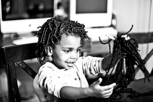 This style had more to do with me proving something to myself than anything else. The last time we did this style, it kind of bombed. Immediately fuzzy... and out within five days. I have been thinking about it since then, wondering if my suspicions were right - last time, the twists were too wide, allowing too much of her new growth/baby hair to slip out quickly.